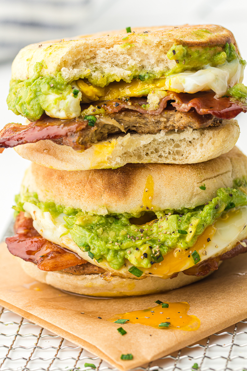 FYI: This easy breakfast sandwich with bacon, egg, avocado, and sausage on an English muffin is ready in under 30 minutes!